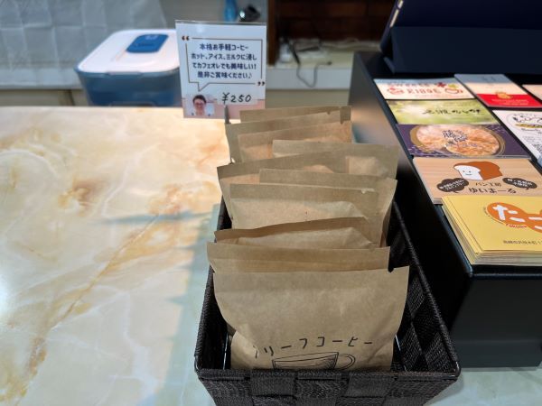 レジのところにお家でも楽しめるコーヒーも販売しております。