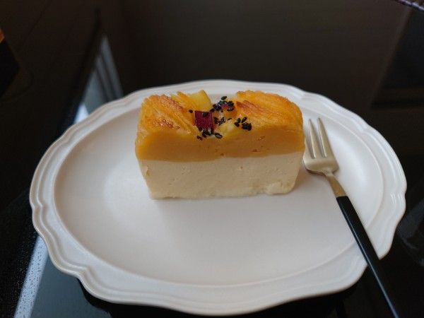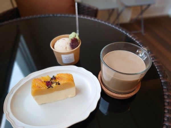 購入したケーキとジェラートを頂きました。今回注文したのはスイートポテトチーズケーキ(641円) 、コクトウオキナワのジェラート(350円)、カフェオレ(330円)の3点にしました。