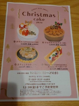 モンブランやシャインマスカットショートケーキ、クッキーシューや、期間限定のスイートポテトチーズケーキなどもあり種類も豊富です!ケーキと言えば12月はクリスマスですね!クリスマスケーキも予約開始してるそうです!