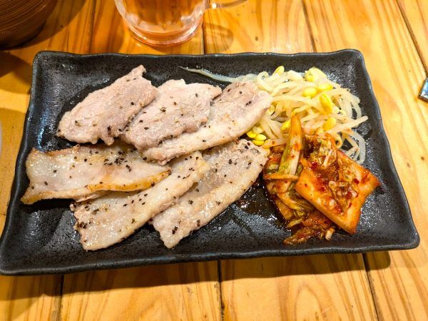 厚めの豚バラ肉がいいですね~。弾力があって、コラーゲンがたっぷりです。白菜キムチとナムルがおいしいです。