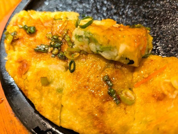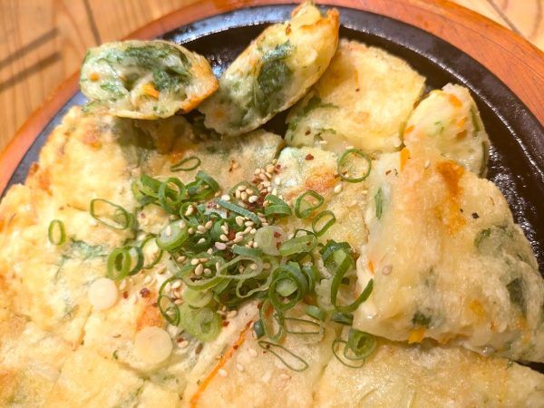 チヂミは小さくカットされています。厚みのあるチヂミですね。外側はパリパリしていて、中はもっちりとしています。野菜がたっぷりです。タレにつけて食べますが、この特製タレがおいしいです。
