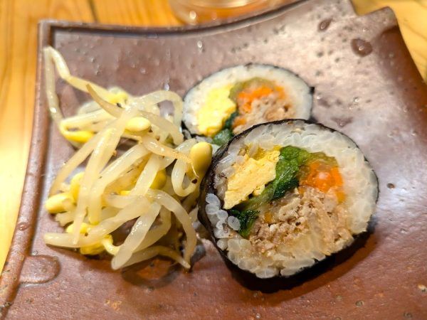 スピードメニューを見ると彩りキンパと書いてあります。確かに綺麗なキンパです。もやしナムルがおいしいんですよ~。