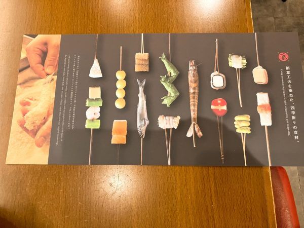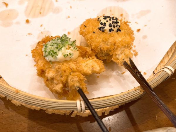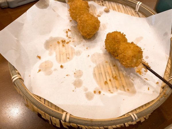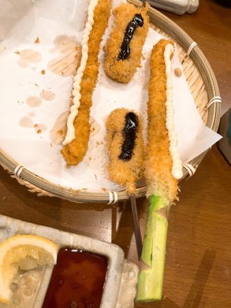 左:鳥南蛮(タルタルソース、あまじょっぱく、おいしい!はじめて!)右:さつまいも・バター添え(びっくり!デザート感覚!串揚げにバターなんて、独創的!すばらしい!)
