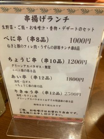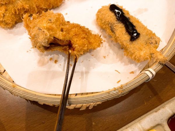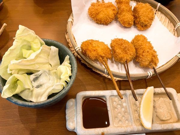 キャベツに氷がのっていて、シャキシャキ!串揚げ左から玉ねぎ、豚フィレ肉&ネギ、茄子。 ソースのほかゆず塩、レモン、ポン酢、ケチャップなどをお好みでつけられるので、飽きがきません。