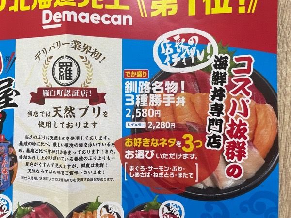 「まぐろ・サーモン・ぶり・しめさば・ねぎとろ・ほたて」の中から好きなネタを3つ選べます。