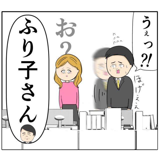 「うぇっ!?」と驚く良し男さんに軽蔑の眼差しを向けるふり子さん。そのとき、ふり子さんに気付いた部長が「ふり子さん」と声をかけました。