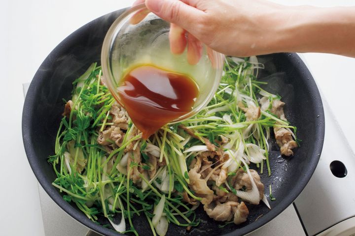 (2)フライパンにサラダ油大さじ1を中火で熱して豚肉を2分ほど炒め、酒大さじ1をふる。豆苗、ねぎを加えてさっと炒め合わせ、〈A〉をもう一度混ぜてから加え、ひと混ぜする。