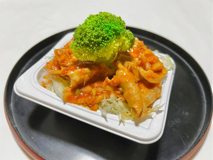 3. 1で温めたご飯の上に千切りキャベツを敷き、その上に2の肉を乗せる。最後に、ブロッコリーを中心に立てたら完成!