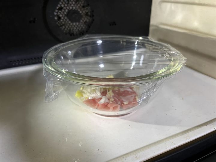 1. パックご飯を電子レンジ600Wで1分30秒温める。残り30秒になったら、水で軽く濡らしてラップに包んだブロッコリーを一緒にレンジに入れて加熱する。レシピでは20秒となっていましたが、もう少し加熱したほうがいいと思い、わたしは30秒にしました。