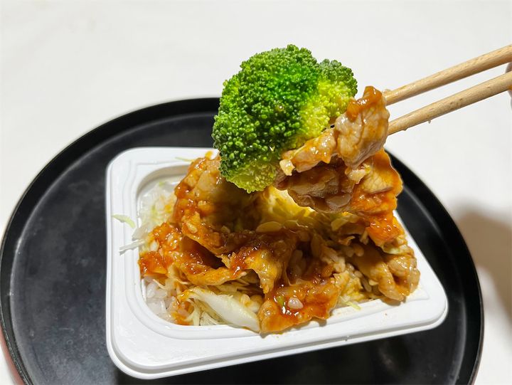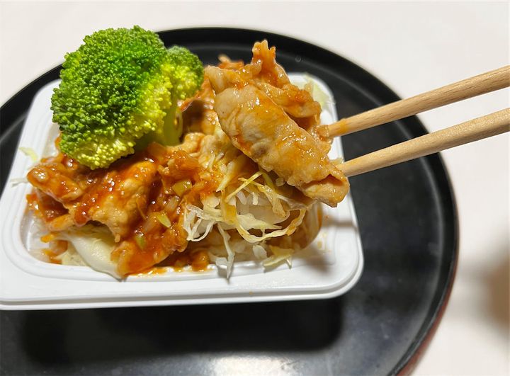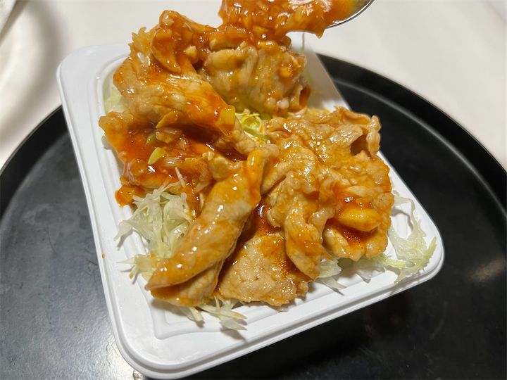 豚肉はレンジで加熱したとは思えないほど柔らかくジューシーです。ふっくらとした豚肉に甘辛ダレがしっかりからんで、ご飯がモリモリすすみます。