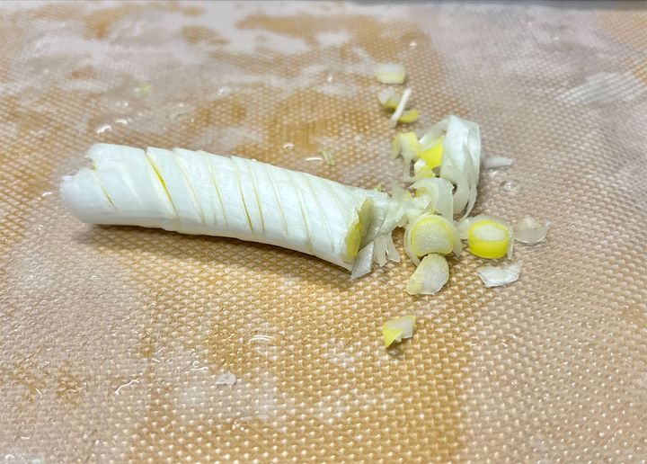 長ねぎは、両面に蛇腹状の切り込みを入れてから輪切りにすると、簡単にみじん切りになりますよ。