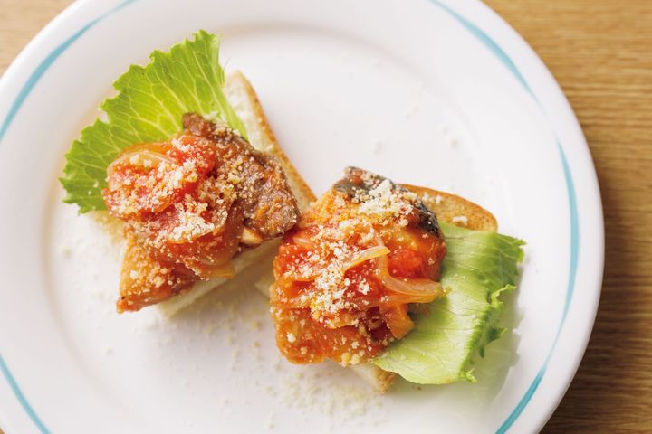 食べやすい大きさに切った食パンをトーストし、レタスとぶりのトマト煮をのせて、粉チーズをふれば、カナッペ風の一品に。