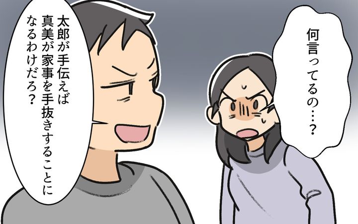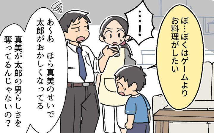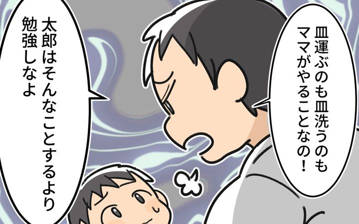 真美は夫の誠一郎、息子の太郎と3人暮らし。もうすぐ小学生になる太郎ママの家事を手伝いたい」といってくれますが「そんなの男のやることじゃない」と夫は息子に家事をさせるのを嫌がります。その原因は…