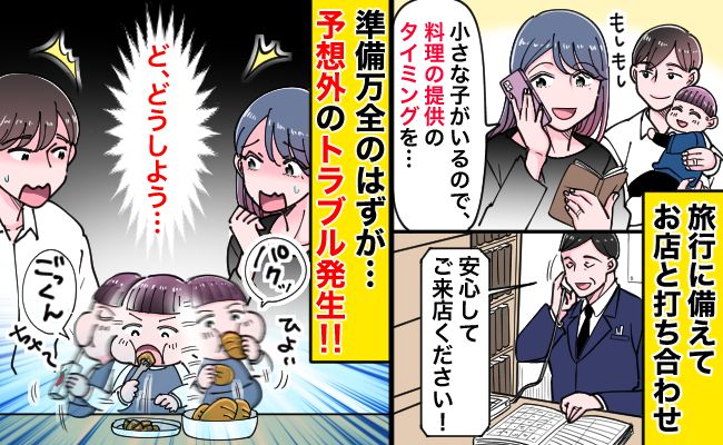 レストランの方からは、急な団体のお客様が立て続けに来店されて、提供が遅れてしまったと謝罪を受けました。レストランの方も他のお客様も誰も悪くないのですが、楽しみにしていたのでとてもショックでした。同時に、私たちの希望を優先させてしまったことで、せっかくの旅行で長男にも退屈な思いをさせてしまい反省しました。このことがあってからは、お店や他の方に迷惑や気遣いをさせないよう、子どもと一緒に楽しく食事ができるプランを立てるよう、今まで以上に気をつけるようになりました。