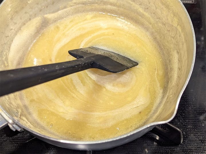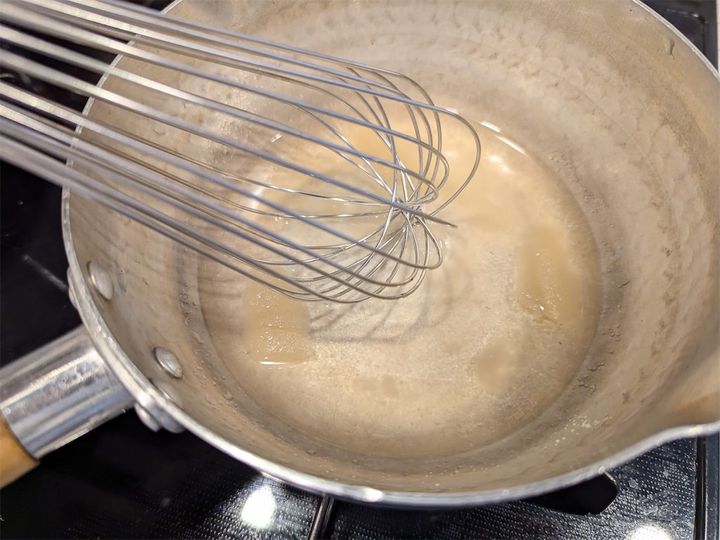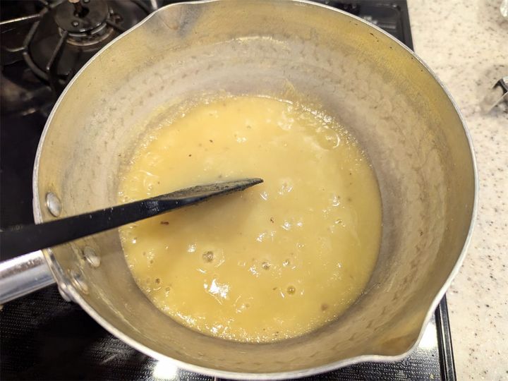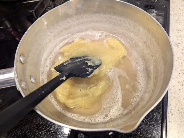 「練り上げる」ということで、水っぽさがなくなるくらいを目指して、弱めの中火で8分くらい練りました。