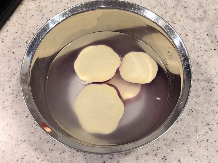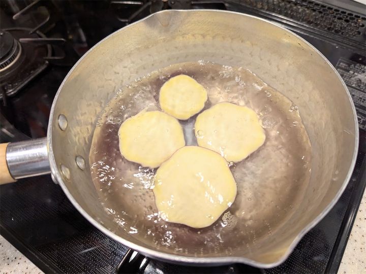1. さつまいもは輪切りにして、厚めに皮を剥き、水にさらす。