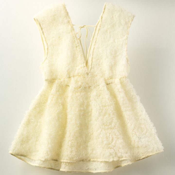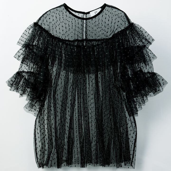 ほんのり素肌が透けるドット柄のブラウスを軸にチュールを大胆に組み合わせたデザインは、華やかな印象。ドット柄チュールブラウス¥30,800(プルミエ アロンディスモン)