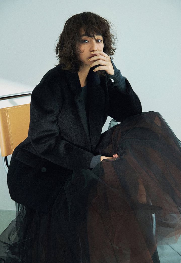 ジャコット¥132,000(ゲミニー/ウィム ガゼット ルミネ新宿店)、ニットプルオーバー¥36,300、ニットバンドゥ¥26,400(共にオーラリー)、チュールスカート¥79,200(カオス/カオス表参道)、ブーツ¥71,500(ピッピシック/ベイジュ)