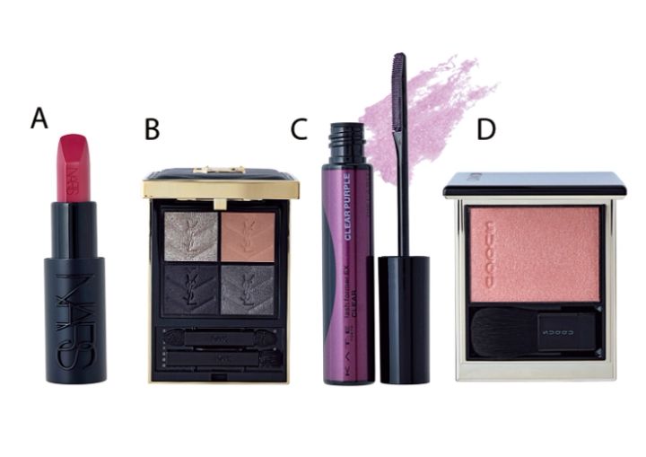 ブルベタイプの人におすすめの秋トレンドカラーが深みのあるプラム。この色のリップを主役に、シアーに色づくパープルがかったチークとマスカラで色をリンクさせてしゃれたムードを演出して。プラムの甘さをほどよくおさえる、ニュートラルなグレーのアイカラーで洗練度もアップ!
