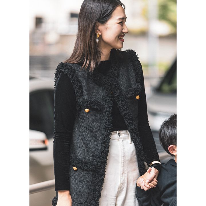授業参観や保護者会のときは、いつものロンTにHYEONのツイードジレを羽織るだけで完結!洒落感・きちんと感・女っぽさの三拍子が揃った名品です。車の運転中でも、腕さばきの良さをキープできるのも◎。