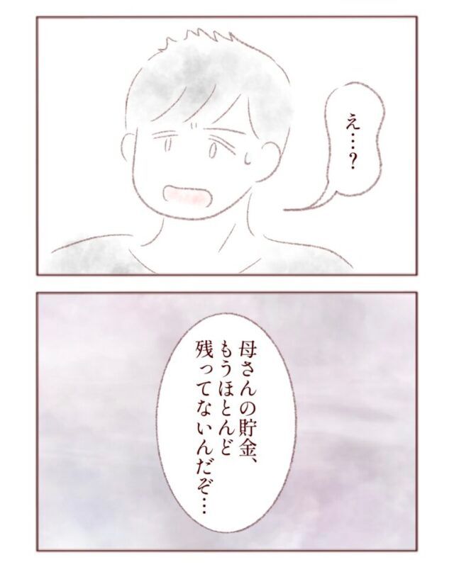 夫の様子に「え・・・」と驚いた様子の浩二さんでしたが、まだ信じられないと言った様子。夫はもう一度、「母さんの貯金、もうほとんど残ってないんだぞ。」と、落ち着いた声で浩二さんに伝えました。