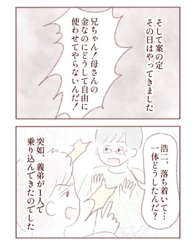 浩二さんの車の買い替え話に嫌な予感しかしていませんでしたが、案の定「その日」はやって来ました。浩二さんがすごい剣幕でやって来たのです。「兄ちゃん!母さんのお金なのにどうして自由に使わせてやらないんだ!」めずらしく1人で駆け込んできた浩二さんは、孝雄さんに食って掛かりました。夫は「落ち着いて。いったいどうしたんだ?」と驚いて言いました。