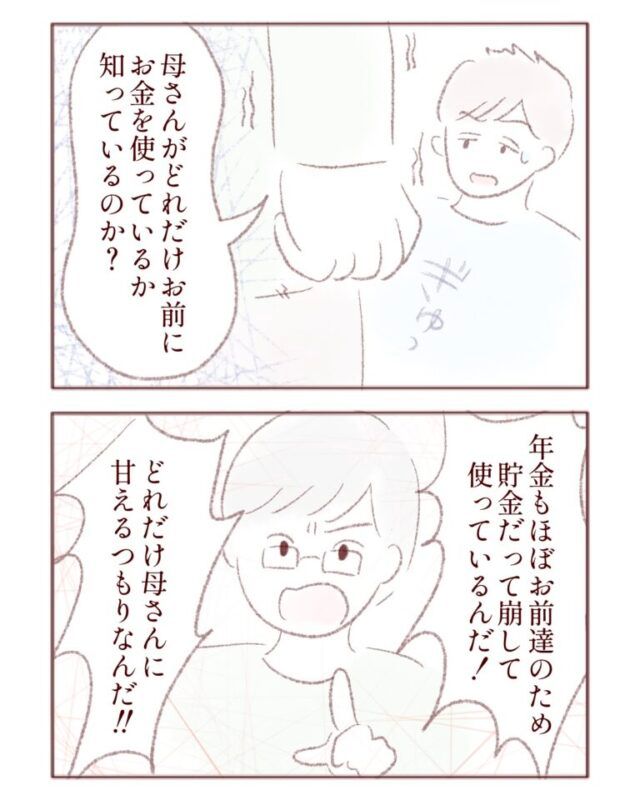 すると状況を把握した夫は「母さんがどれだけお前にお金を使っているか知ってるのか?」と言いました。「年金もほぼお前たちのため、貯金だって崩して使ってるんだ!どれだけ母さんに甘えるつもりなんだ!!」浩二さんにピシャリと言いました。