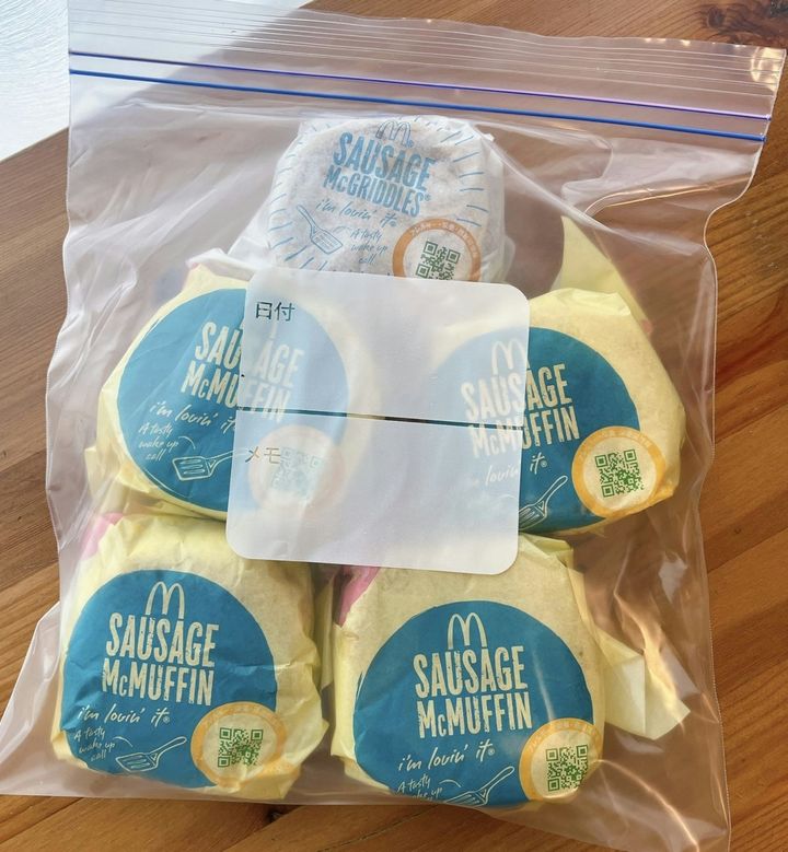 冷凍保存用の袋に入ったソーセージマフィン。瓶詰地獄さんは、この状態でいつも冷凍保存をしているそうです。解凍時間は、各家庭のレンジの仕様やワット数で異なるので、少しずつ試しながら探るのが良いようですよ。この投稿には「Xやってて良かったと心の底から思えた瞬間でした」「家にあると一気に食べたくなっちゃう」「マックはいつもすぐ食べちゃうから、冷凍って考えなかった」といったリプライがついていました。