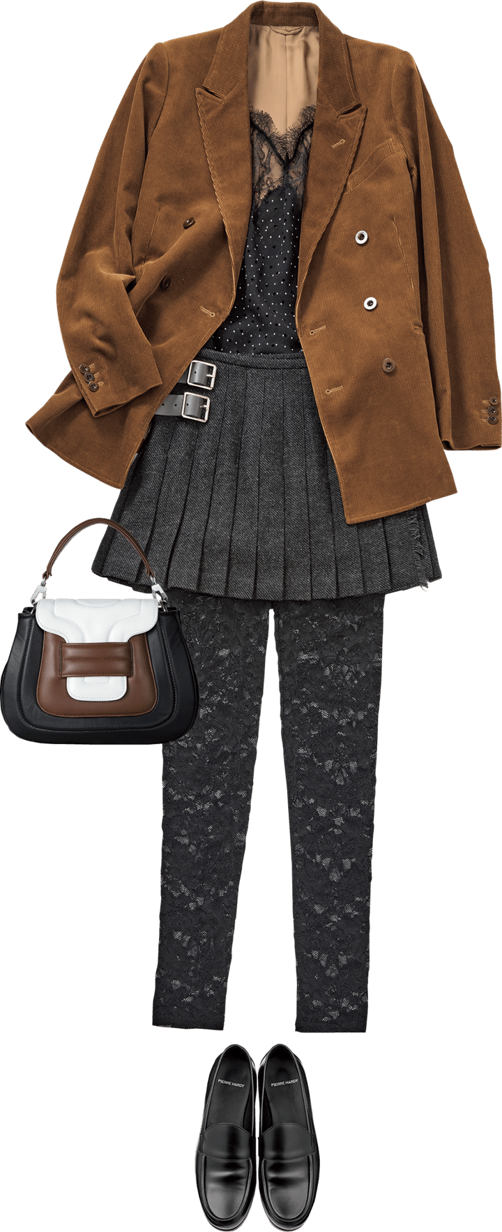 ジャケットは質感にも注目を。スエードやレザーなど秋冬らしい深みある素材を選ぶとさらに旬度UP! さらに、ブラウンをアカ抜けさせるポイントは“肌感”。キャミソールやレギンスのレースから透ける肌の軽快さが、今季らしさを生んでくれるはず。レイヤードで遊んだ分、足元はグッドガールなローファーで。それでいてトラッドに仕上げないのが、断然今っぽい。
