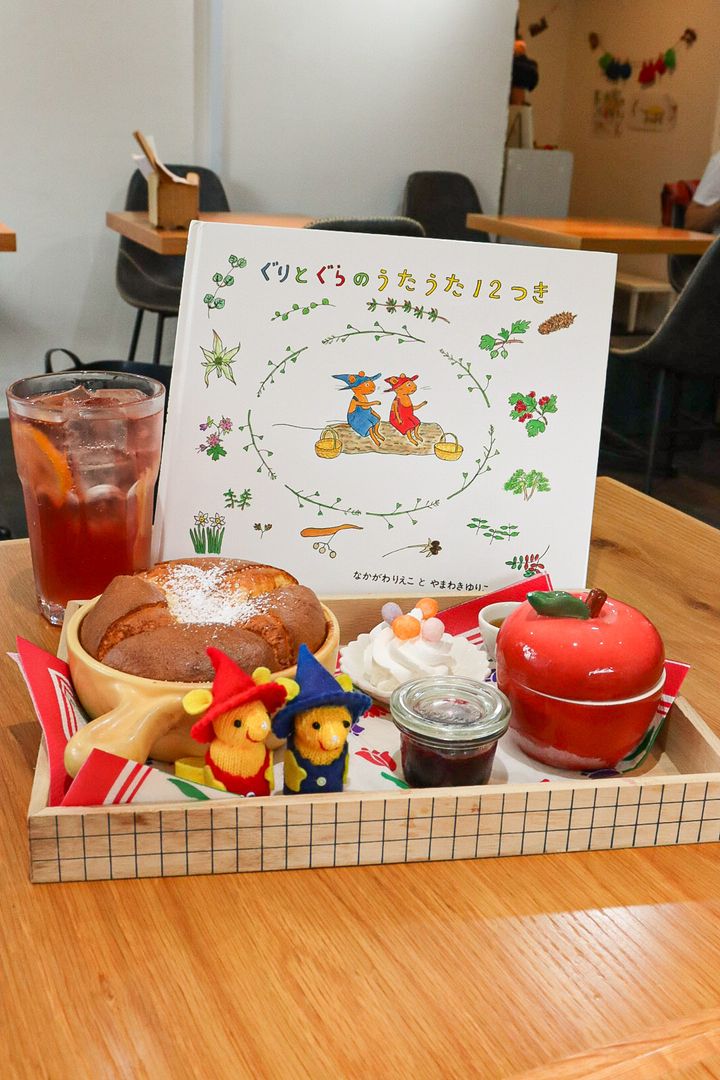 絵本のモチーフになっている人形や何もの絵本のある、落ち着いた空間のカフェ。