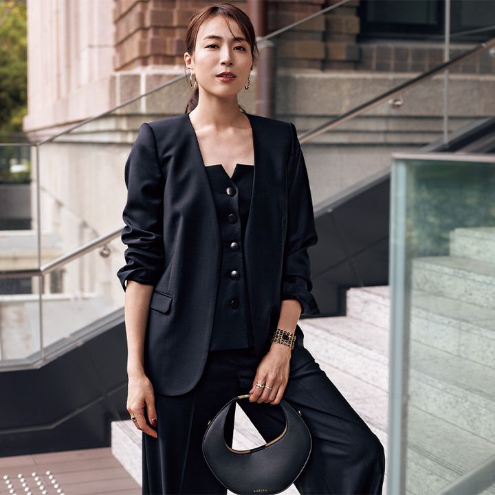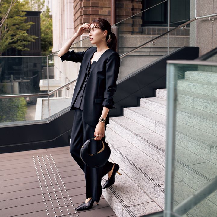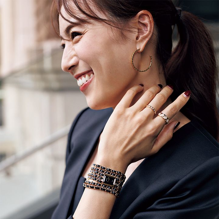 連なるチェーンブレスレットがカフのように手首を覆って、ドレスウォッチの華やかさとスーチングに映えるハンサムさを両立。サードマガジンから登場したセレモニーラインの女っぽい三揃えは、大人の女性の理想を叶えてくれる。