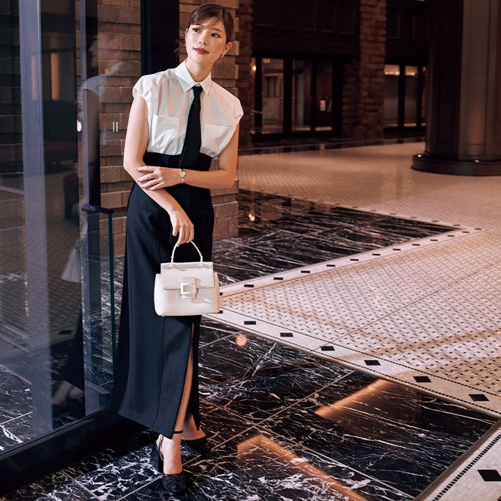 イヤリング¥616,000リング¥440,000(すべてカルティエ/カルティエ カスタマーサービスセンター)タイ付きシャツ¥29,700(デ・プレ)スカート¥46,200(ケイル/ユナイテッドアローズ 有楽町店)靴¥143,000(ノダレト/ユナイテッドアローズ 六本木ヒルズ店)バッグ¥391,600(ロジェ ヴィヴィエ/ロジェ・ヴィヴィエ・ジャパン)