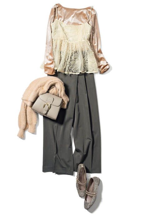 冬素材のベロアと軽やかなチュールの掛け合わせが旬度抜群。パンツスタイルにチュールで甘さをON。
