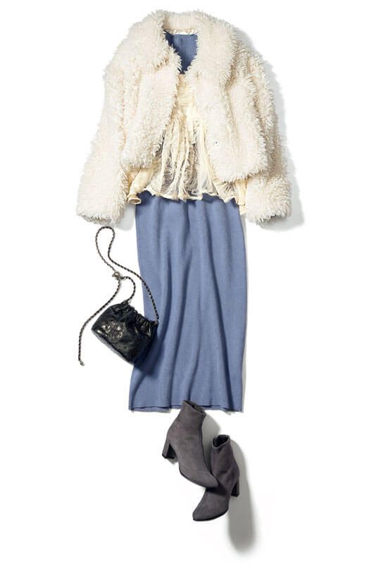 ボリューミーなコートからのぞくチュールキャミがボアの重さを引き算! のっぺりしやすいニットワンピもメリハリが出て、着痩せして見えます♡