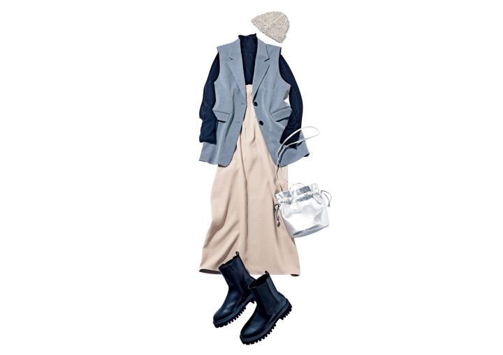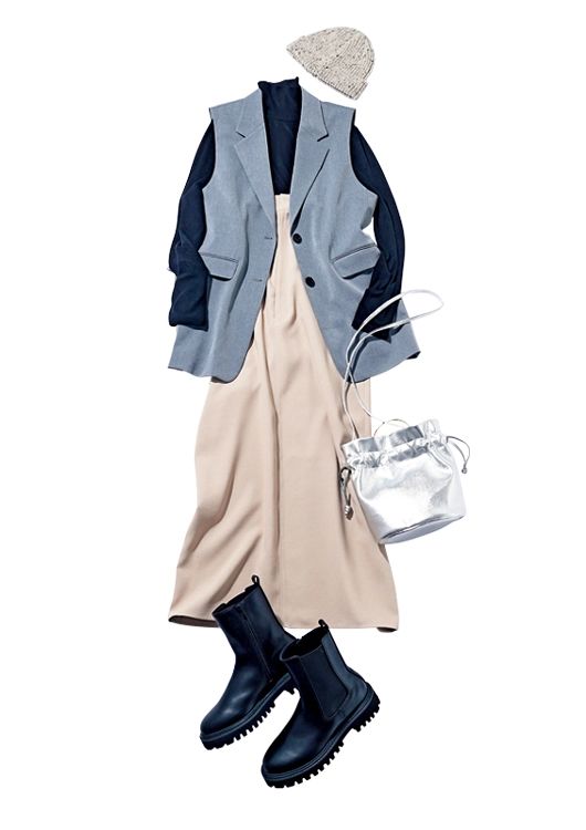 ジャンスカにジレを合わせた品ありカジュアルコーデ。朝晩の冷え込みに対応するブーツとニット帽が必須。ベーシックトーンでまとめつつ季節感のあるアイテムでコーデの旬度を高めて。