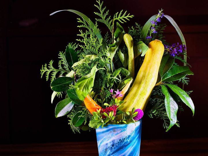 野性味を放つ生けた姿を目にしたあと、ブーケはアートに変貌する。鮮やかなサフランソースの黄色とアップルバターのピンクの躍動感が心を掴む。