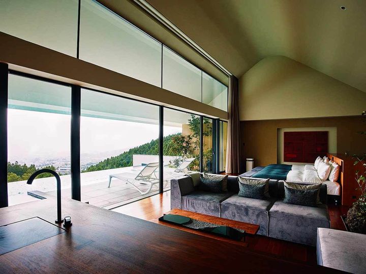 最上階に位置し、森がすぐ隣に広がる「ヒルトップ スカイパビリオン シティビュー」(165㎡)。10mものパノラミックな窓の外に温泉露天風呂とインフィニティプールを完備。山に囲まれた湯布院全域を望み、稜線から朝陽が昇る。2名1泊1室1名¥181,500~(2食付き)
