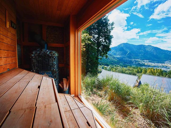 「ヒルトップ スカイパビリオン」のさらに上に、今秋からセルフロウリュのフィンランド式サウナをオープン。天然水の水風呂と、ととのいスペースも設置する。それらすべてが湯布院の街を一望。ふたりきりの会話と絶景を楽しみながら、ととのうことができる。3時間2名¥55,000