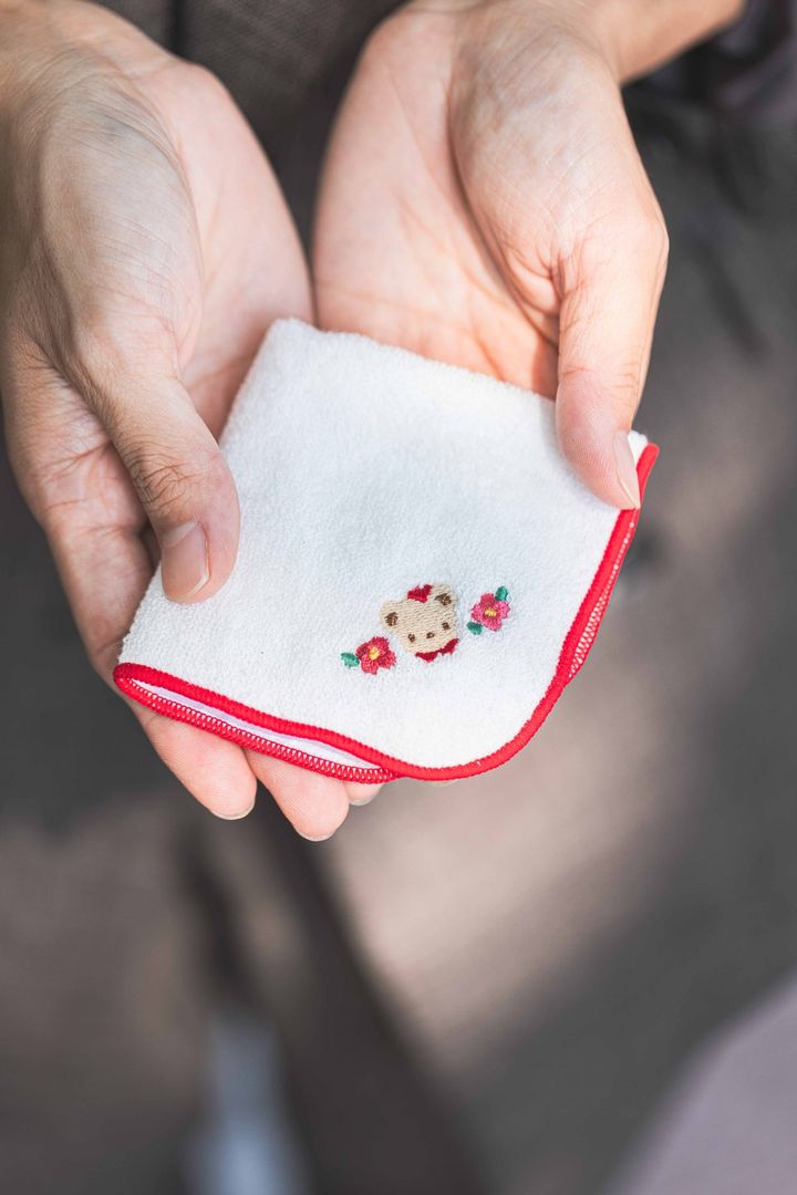 「出産祝いで義妹にプレゼントされたハンカチはサイズが16㎝×16㎝と小さめなのでミニバッグのときに大活躍です。ワンポイントの刺繍が可愛く、色違いのブルーも持っています」安藤也恵さん・40歳(158センチ/7歳と5歳女の子と1歳の男の子ママ)