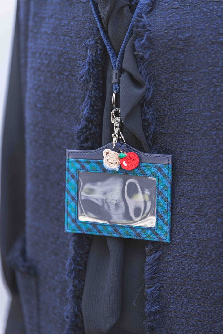 「ファミリアのネームホルダーは娘の幼稚園入園のタイミングで購入しました。グリーンのチェック柄で悪目立ちせず、ネイビーコーデにも合わせやすいです。ファミちゃんとリンゴのチャームがポイントになっているところもかわいくてお気に入りです」石川佑里子さん・33歳(165センチ/9歳と7歳の男の子、3歳の女の子のママ)