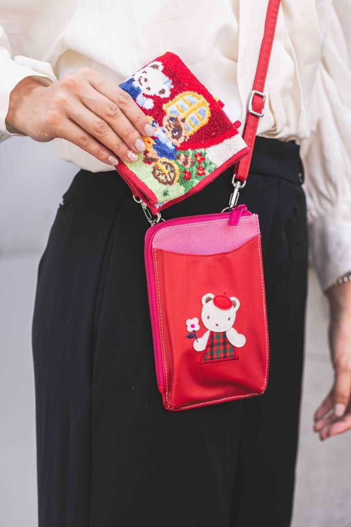 「携帯ホルダーはファミちゃん×真っ赤なカラーに一目ぼれ。ポケットの内側がリバティ柄になっているのもお気に入りポイントです。園の送迎時や公園遊びのときに鍵と携帯を入れると両手が空くので助かります。ファミリアのハンカチはデザインが可愛いのはもちろん、コンパクトで吸水性も高いので娘とのお出かけの際に持ち歩いています」大塚麻依子さん・35歳(160センチ/9歳と5歳の男の子と2歳の女の子ママ)
