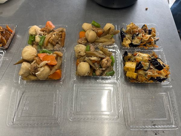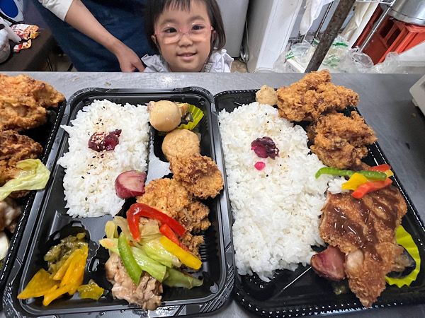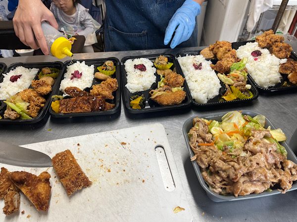 さていよいよ開店間近となり、お弁当の準備が始まりました。メニューはボリューム(大盛)とライト(これで普通盛?!)の2種類から選べます。1番人気はチキンカツ&唐揚げのお弁当