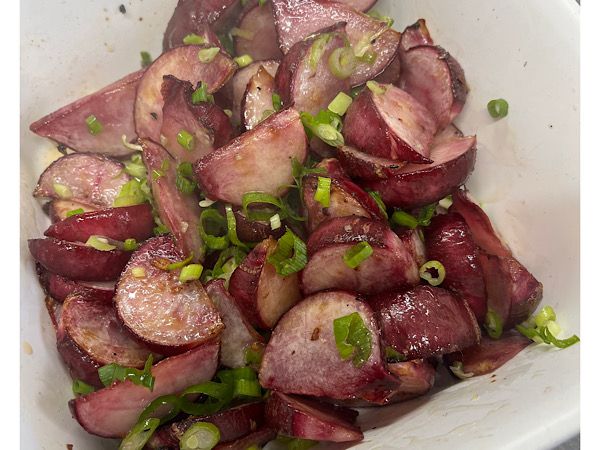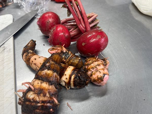 近くの畑で採れた里芋と赤カブ。農家さんはまだ若く、チャレンジングな方なので、新しい品種にも果敢に攻めて作っています。せっかくだからこれで一品足したい!と、副菜を作り始めるともえさん。鮮やかな調理スタイル!それぞれの素材の良いところを熟知しています。ともえさん、「地産地消」の気持ちで、地元の生産者の皆さんを応援したいんですよ、と教えてくれました。