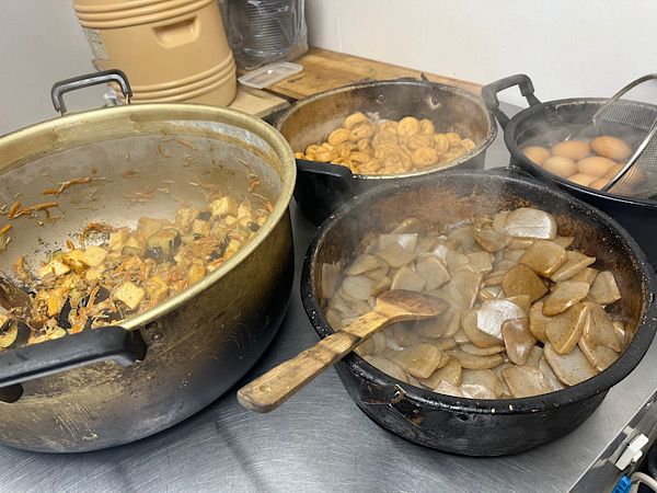 夜明け前の寒いとある日。ラブリーはほとんど毎日早朝3時から始まります。早朝というより深夜です。ラブリーといえばドカ盛り、ドカ盛りといえばメインの揚げ物と思われがちですが、揚げ物はできるだけ揚げたてをお渡ししたいので作り置きはほとんどしない、そして副菜の惣菜もしっかり添えたい、という思いから朝は副菜準備からのスタートです。茄子と厚揚げの肉味噌まぶし、根菜のごった煮、温泉卵、がんもの煮物、どんどんと出来上がりました。季節のお惣菜なども含めると、副菜は50種類は優に超えるレパートリーということです。