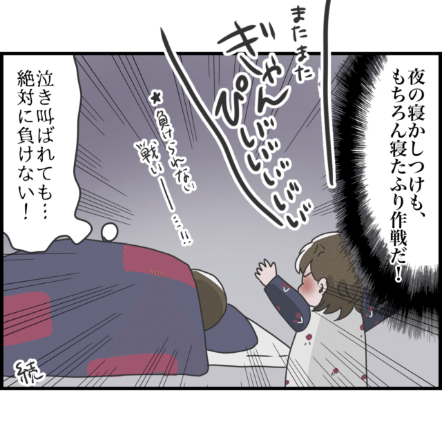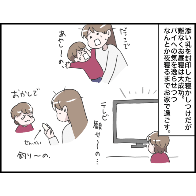 卒乳が理想だったけれど、最終的には断乳を決意したしおさん。断乳開始1日目は朝から不機嫌MAXな娘ちゃんに長期戦を覚悟したものの、テレビを見せたり児童館に出かけてなんとか娘ちゃんの気を逸らすことに成功。そして帰宅後にお昼ご飯を与えてみると、今まで見たことがないほどよく食べてくれた娘ちゃんを見て嬉し涙。しかし、お昼寝は苦戦。添い乳を求めて泣く娘ちゃんにしおさんは寝たふりで対抗するしかないのでした。