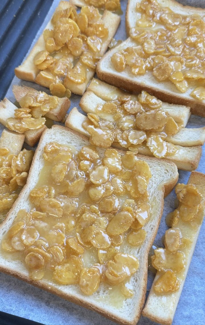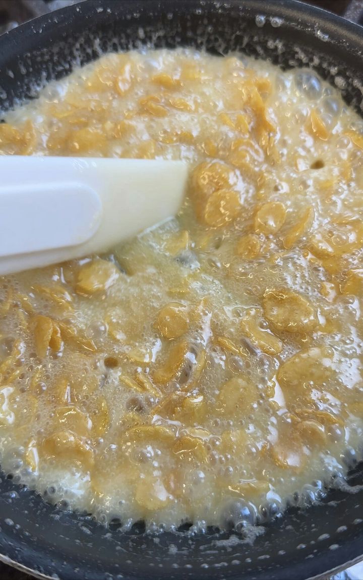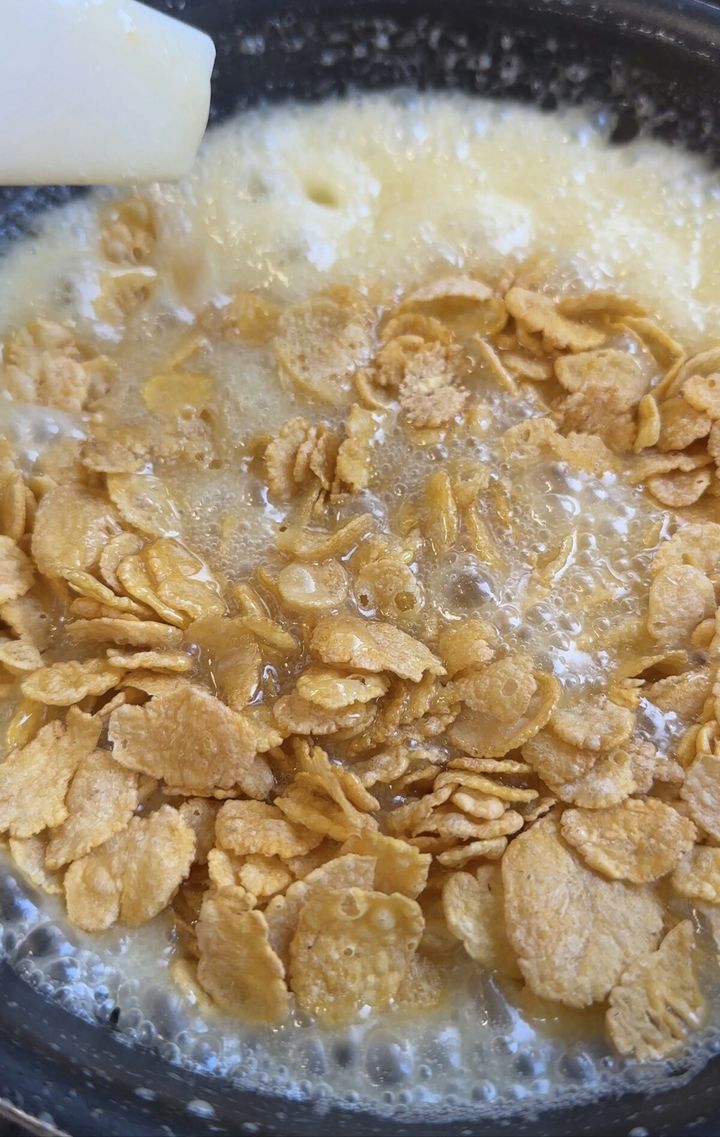 1.食パンとコーンフレーク以外の材料を全て鍋に入れ、火にかける。ぶくぶく泡になったら、コーンフレークを入れて絡めます。