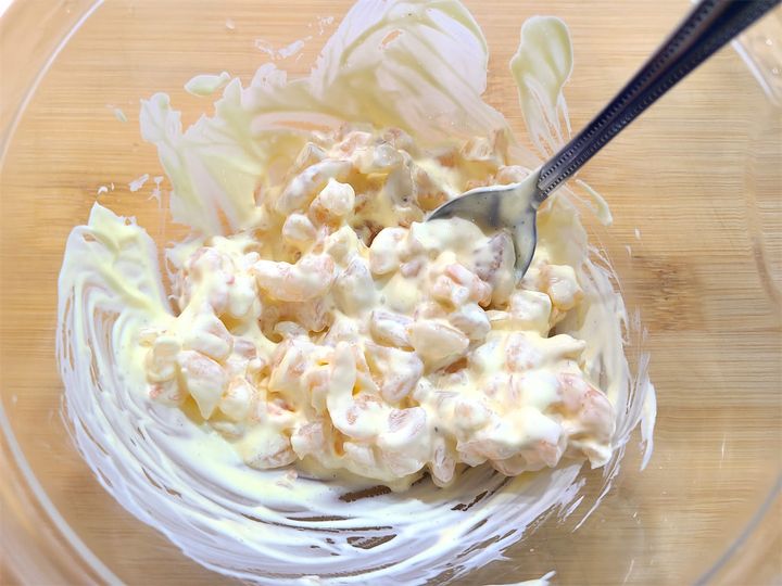 2. ボウルに1と塩、マヨネーズを加えてよく混ぜます。まずは具材のエビマヨの完成です。