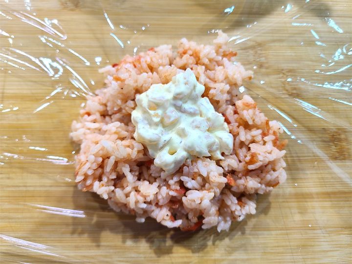 6. ラップの上に5のご飯をおにぎり1つ分広げ、2をのせます。