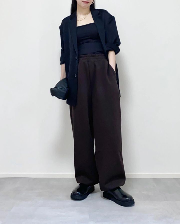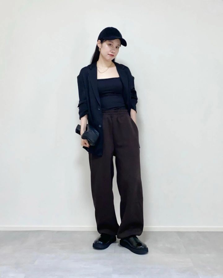 ブラウンのスウェットワイドパンツとブラックのジャケットを合わせたこちらのコーデは、まさに海外ガールな着こなし♪アウターにジャケットを選んだことで、とびきりかっこいい雰囲気になります。キャップでほどよくカジュアルダウンし、遊びのあるファッションに。デコルテが見えるインナーをインして艶っぽい印象に仕上げるおしゃれにも、ぜひトライしてみてくださいね♡