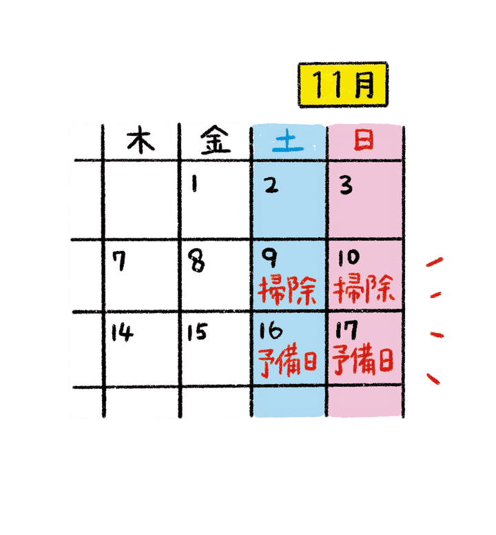 掃除や片づけは2〜3回に分散を。予備日もつくるとよし